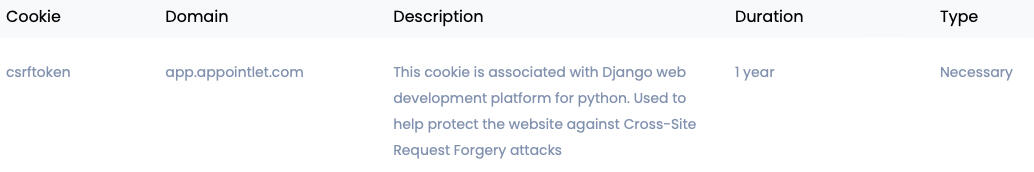 Currently, the only cookie used is csrftoken, and it appears exclusively on the pages where users can book appointments online. This is a technical cookie provided by Appointlet (our appointment scheduling system), and its sole purpose is to protect against cyber attacks.